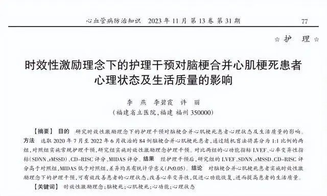 [1] 李燕.时效性激励理念下的护理干预对脑梗合并心肌梗死患者心理状态及生活质量的影响, 心血管病防治知识 ,2023-11-05.